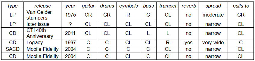 I have five copies. And all five sound like different mixes to me. Instrument placement, balance, spread, and reverb all differ. Here are the different characteristics of the mixes of the song Two’s Blues: