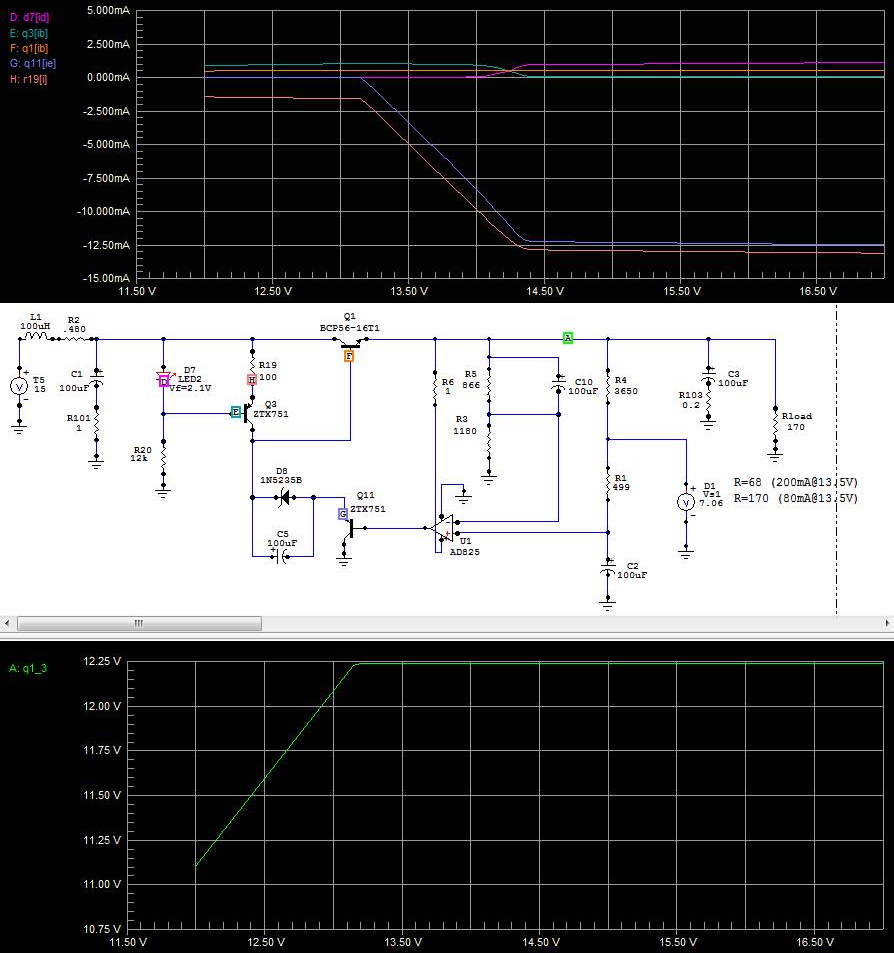 The cyan curve is the current through the current source’s bias LED. It’s zero until the input voltage reaches 14v, then increases to 1mA at 14.4v. Meanwhile, the base current of the current source transistor is 1mA, then it drops to about 80µA when the current source is working properly at 14.4v input. These two currents swap values through this transition. Meanwhile, at any input voltage, the LED current setting resistor (R20) gets a constant 1mA, whether coming from the LED or transistor base.