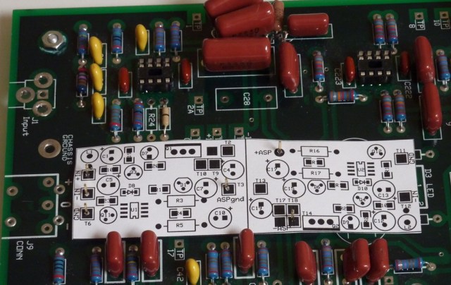 Siegfried’s w-ASP board (woofer ASP) has the same hole pattern and DC filter. The Hubble should fit on these too. Provision was made for one capacitor on the w-ASP that intrudes into the Hubble’s footprint.