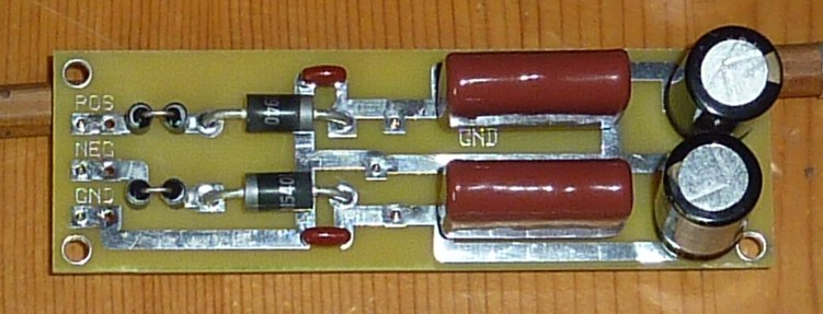 The board can be split in the middle and used for independent single positive and negative regulators. The layout was constrained somewhat by the placement of holes for the pins that would connect the raw inputs and regulated outputs to the ASP. Round pins and machined collet-type sockets were used. The pins are visible in these photos.